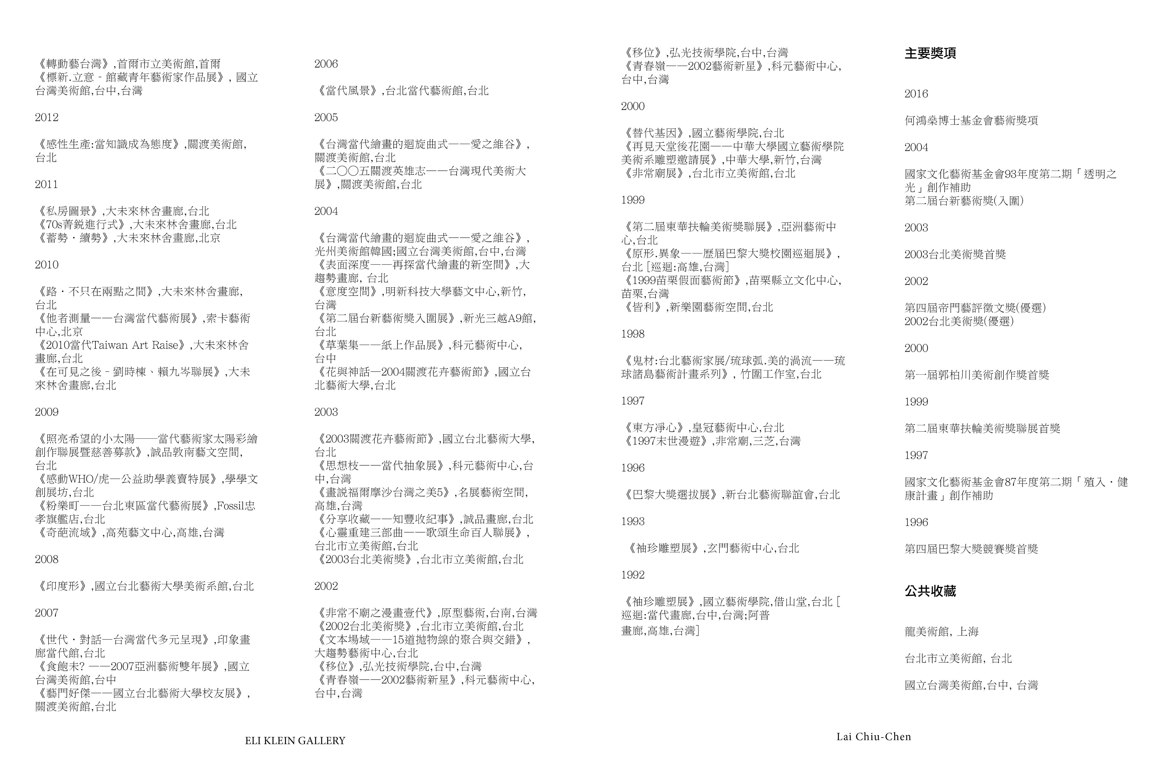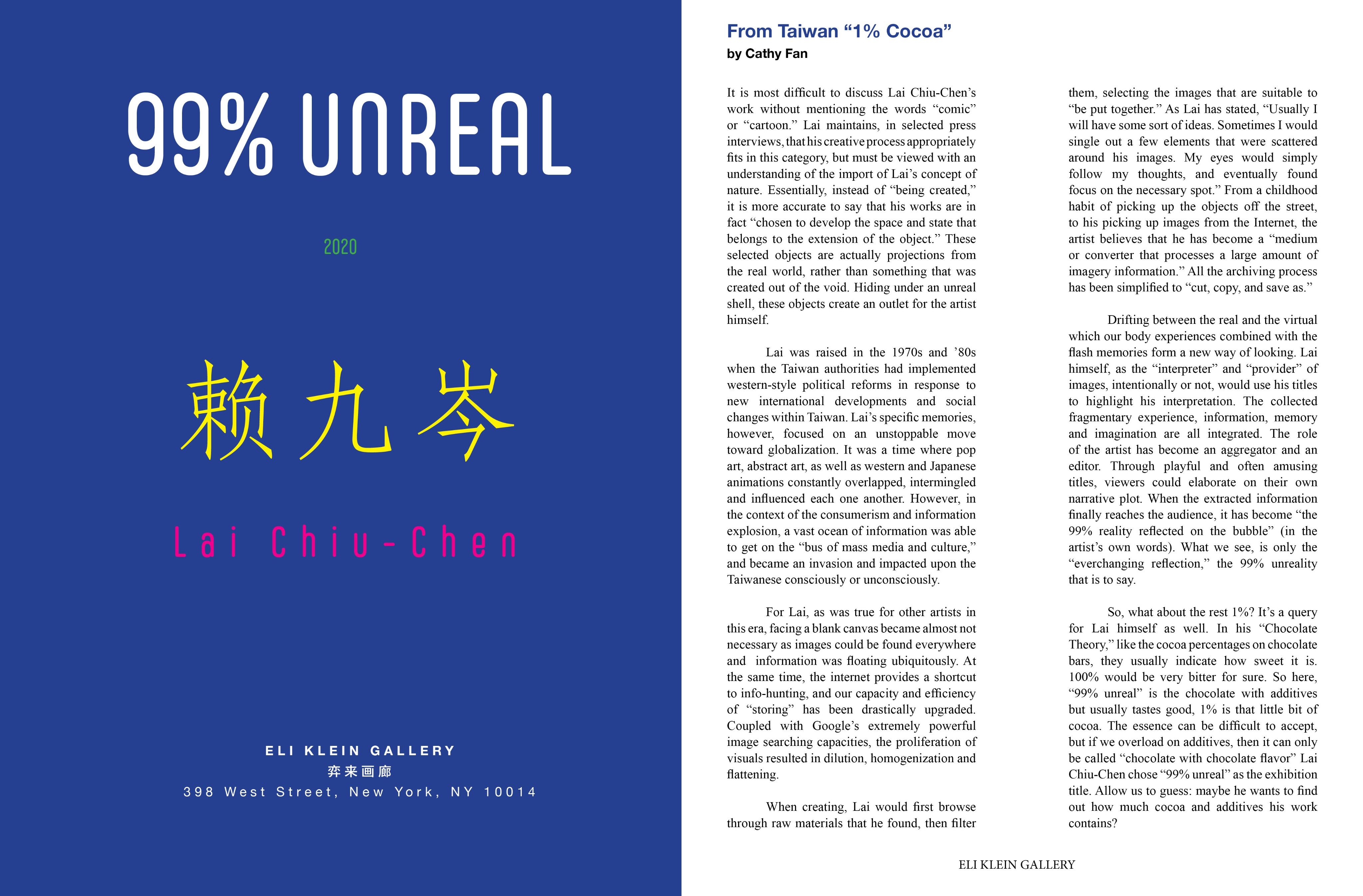 At Eli Klein Gallery, I collaborated with artist Lai Chiu-Chen to design the layout for his exhibition catalog. My responsibilities included laying out the artist's works and biography using Adobe InDesign and Photoshop, creating a visually appealing and informative presentation of Lai Chiu-Chen's art and background, and working closely with the artist and gallery staff to ensure the design aligned with their vision.