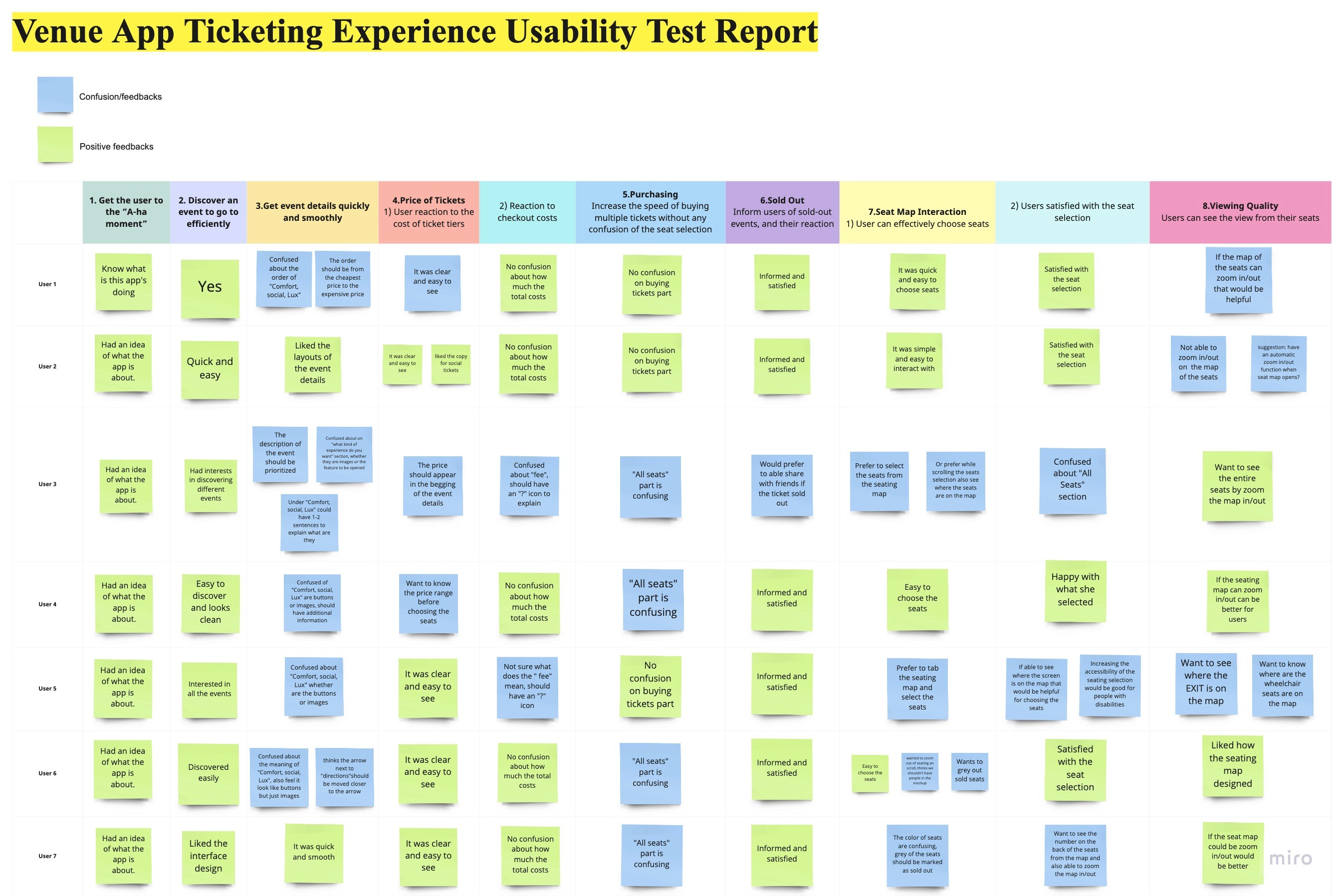 I employed affinity mapping on Miro to visually organize data into two categories. I used green to indicate participants' satisfaction and blue to gather information on participant confusion and feedback.
